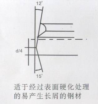 減小槍鉆內、外刃角度,即槍鉆內外刃磨的更平一些,對加工斷屑有很大的   幫助。另外,切削線速度的提高,對斷屑效果也很明顯。加工不易斷屑材料   時,槍鉆端刃可以參考如下角度: